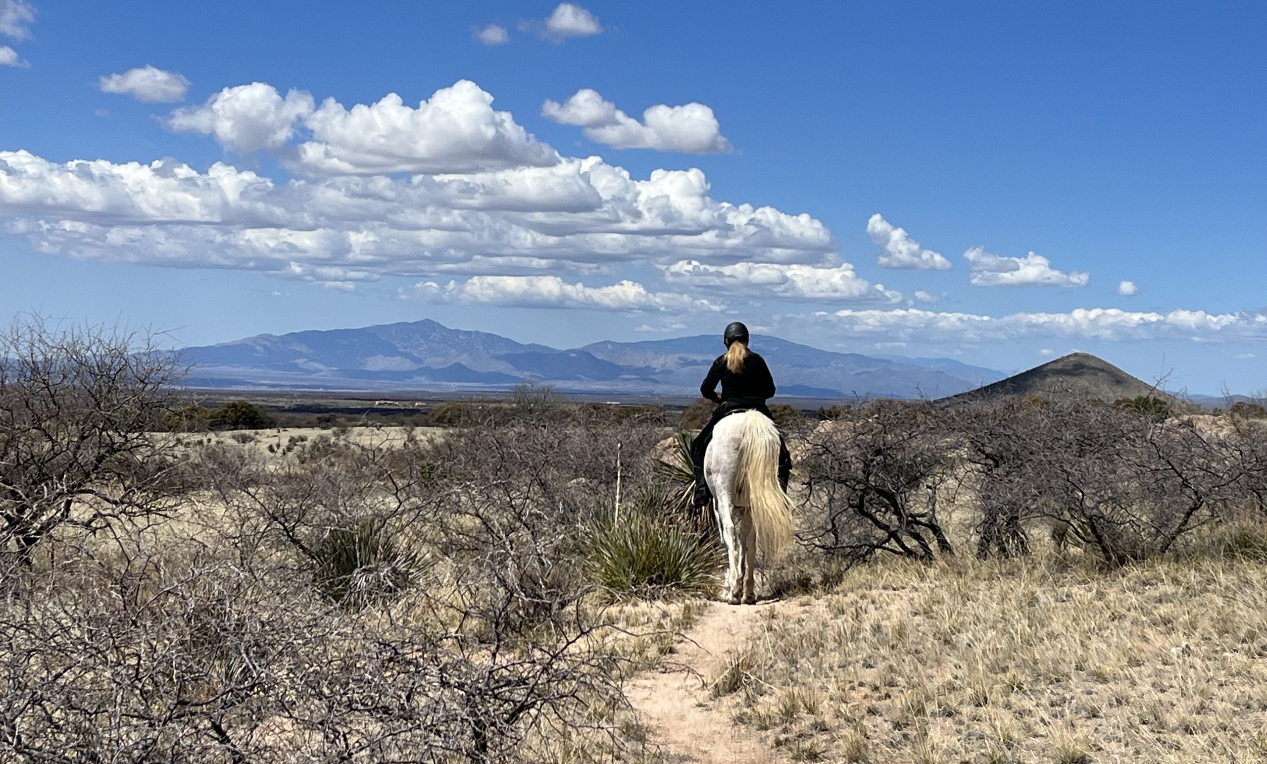 For our second ride, we essentially retraced our ride towards Council Rock. It is a steep climb up to the actual area where the Native Americans “counseled” and it is not a horse-friendly trail. When we rode here in 2020, we had a friend along who held our horses while we climbed up the trail on foot. Nevertheless, it is a beautiful ride through the Dragoon Mountains and some open plains. This is the ride we took on our day trip a few weeks ago.